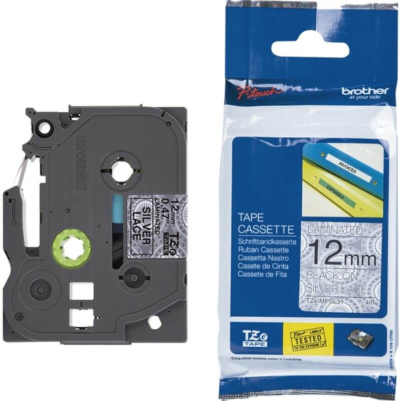 Fita laminada, 100% original Brother, para utilização nos rotuladores P-Touch. A fita decorativa MPSL31 possui fundo prata com estampa de renda, com impressão em letra preta, sendo uma ótima opção para comércio e identificação de equipamentos.